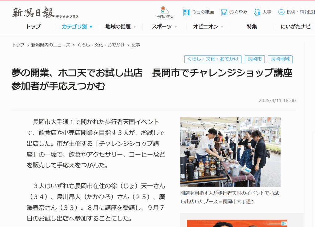 弊社(株式会社RAINY WORK)が企画・設計を担当した 「チャレンジショップ講座」 が、長岡市主催・一般社団法人新潟県起業支援センター(CLIP長岡)との協働で進められており、このたび新潟日報に取り上げていただきました。
